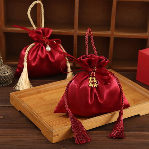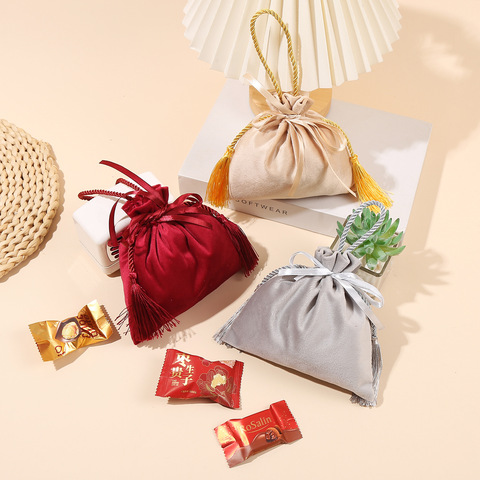 卸売中国風ワインレッドベルベットフリンジハンドルウェディングキャンディーバッグタッセルベルベットバッグ